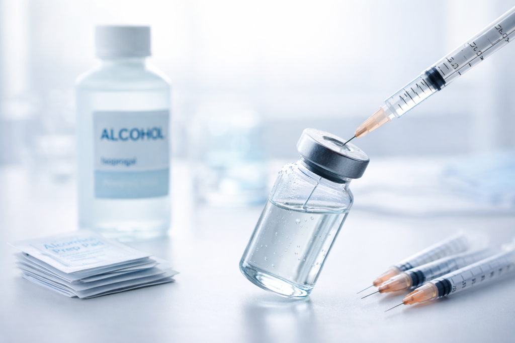 Using a fresh alcohol prep pad, wipe the rubber stopper on the BAC water vial and the peptide vial with a firm, single-direction stroke (not back and forth). Let both dry for 15–20 seconds. The alcohol must fully evaporate before needle insertion—wet IPA carried into the vial on the needle tip can damage protein-based peptides over time.