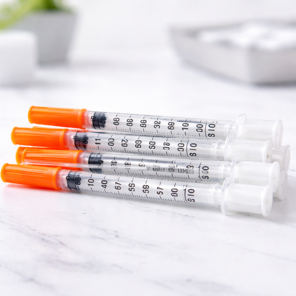 Why insulin syringes: They’re designed for subcutaneous injection with fine-gauge needles that minimize discomfort. The small capacity (0.3-1.0ml) allows precise measurement of small doses.